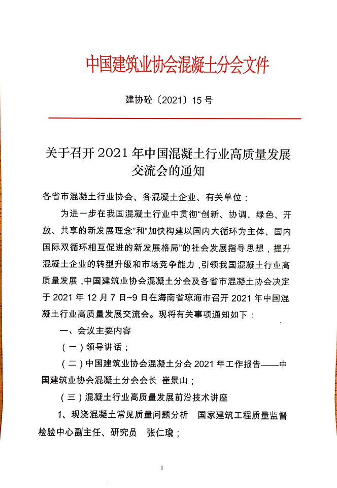 关于召开2021年中国混凝土行业高质量发展交流会的通知