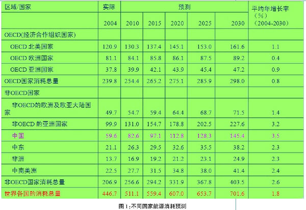据IEA(国际能源机构,International Energy Agency)预测,至2030年,全球平均能源消耗年增长率为1.8%,而中国为3.5%,高于其他国家尤其是经济合作组织国家。(见图1)