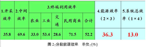 2.能源效率低,产品能耗与国际先进水平有较大差距。我国的开采效率是35.8%;中间效率包括运输、转换等,在69.6%;终端的利用效率,工业53.4%,农业33%,交通的更低,这些总的综合在一起是52.2%,最后再乘以中间效率、开采效率,我们整个能源系统的总效率只有13%,跟国外相比大概差了10个百分点。(见图2)