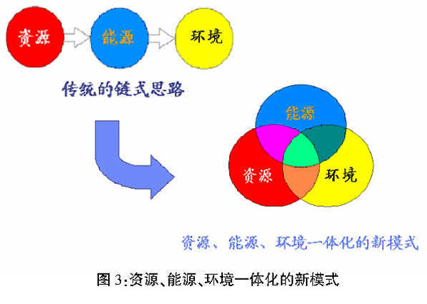 节能是指加强用能管理,采取技术上可行、经济上合理及环境和社会可承受的措施,从能源生产到消费的各个环节,降低消耗、减少损失和污染物排放,有效、合理地利用能源。科学用能是研究用能系统的合理配置和用能过程中物质与能量转化的规律以及它们的应用,以提高能源利用率和减少污染,最终减少能源的消耗。科学用能有三重涵义:一是“分配得当、各得所需、温度对口、梯级利用”,提高能源和资源的综合利用率;二是能源与环境的协调,把能量转换与物质转换紧密结合,注重控制废弃物与污染物的形成、迁移、转化与分离,在能源利用的同时,分离、回收污染物;三是转变传统的能源利用模式,形成资源、能源、环境一体化模式,实现资源循环利用,最大限度地减少“废物”和“废能”。(见图3)