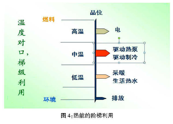 热能的阶梯利用(见图4)就是指把燃料产生的高温气体进行回收,高温的用来发电,中温的用来制冷,低温的用来采暖和生活用水,剩下的一小部分再排放出来,这就是我们通常讲的温度对口,梯级利用。我们要采用先进的燃烧技术,包括水煤浆、煤粉燃烧,还有现在正在考核的高温空气燃烧技术等。这里要注意一个问题,为了提高换热的效果,我们常常会增加流速,而增加流速的同时能耗也会增加,所以我们要把这两者协调处理。