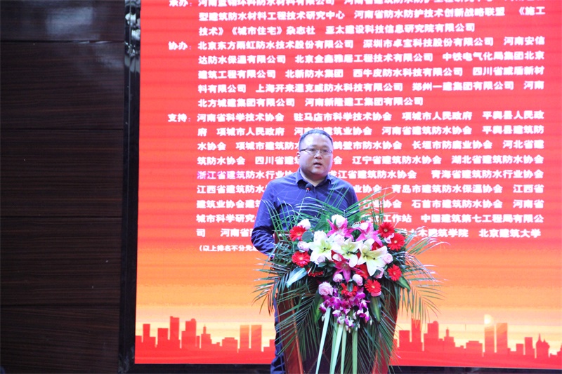 河南省建筑防水防护工程研究中心主任、蓝翎环科董事长李宏伟代表承办单位致辞。他对分会领导、专家的支持表示感谢,并热情邀请与会代表到老家平舆感受防水之乡的风采和当地人民的热情。他说,防水同仁应共同聚力、携手砥砺前行,方能开创出新的局面;作为承办方,愿与同行多交流学习,共促行业防水技术水平的提高。