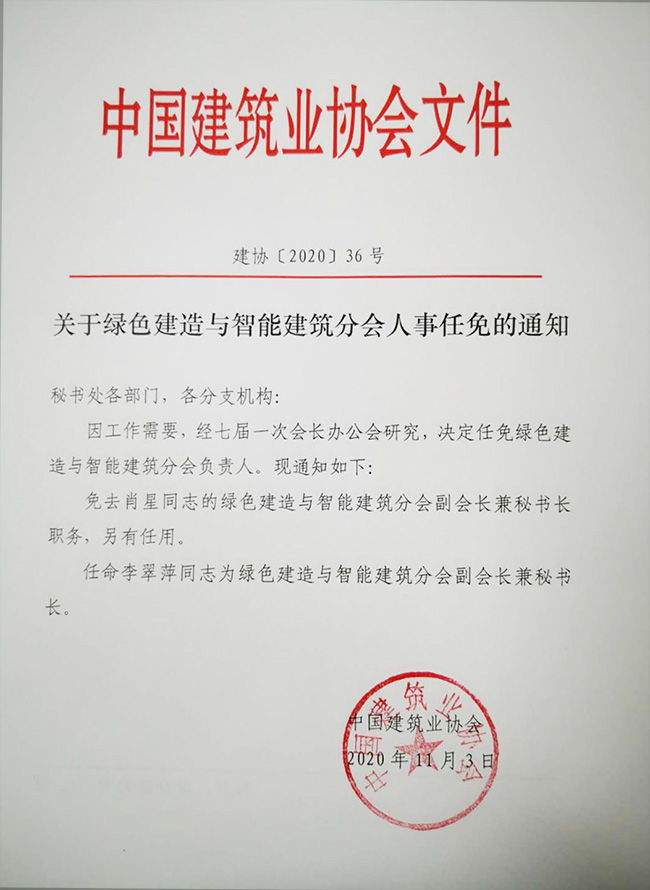 167.net必赢官网关于绿色建造与智能建筑分会人事任免的通知