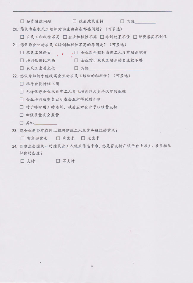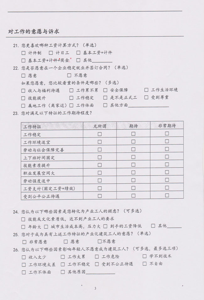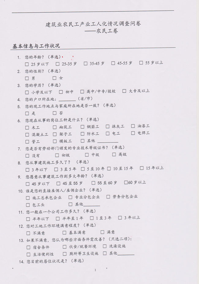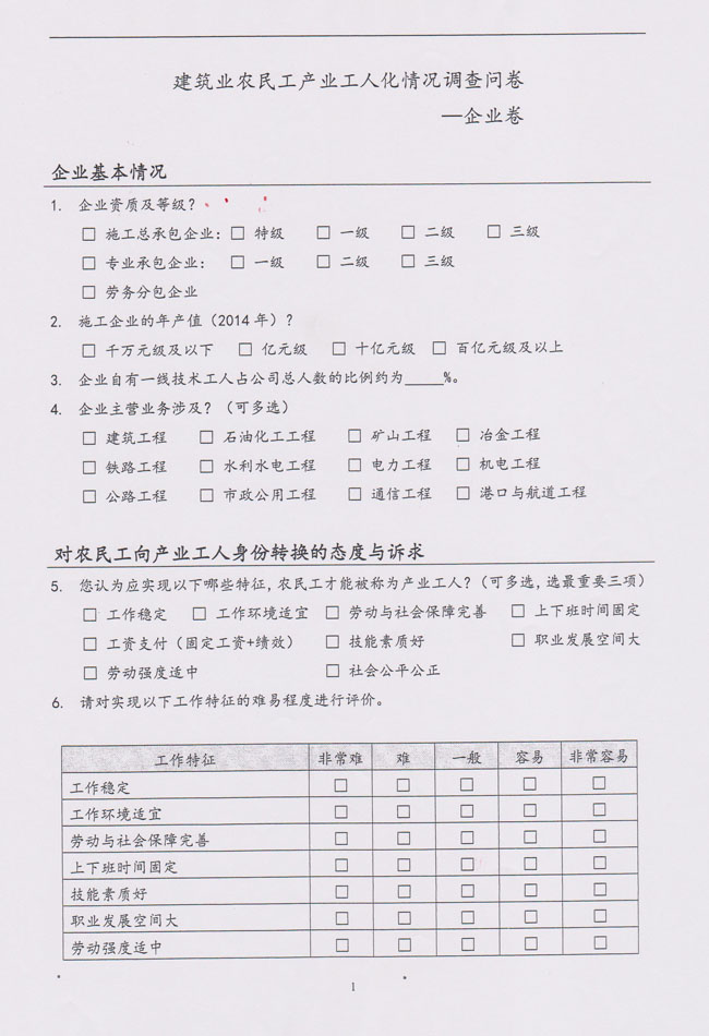 为更好地为建筑业农民工服务,培育建筑业产业工人队伍,住房城乡建设部建筑市场监管司委托重庆大学开展“建筑业农民工转化为产业工人研究”,并于近日发出《关于开展建筑业农民工有关情况问卷调查的通知》,要求我会组织施工总承包企业、专业承包企业和劳务企业进行调查。这项工作关系到建筑业持续健康发展,请各会员企业予以高度重视,认真填写《建筑业农民工产业工人化情况调查问卷——企业卷》,并组织不少于15名工人填写《建筑业农民工产业工人化情况调查问卷——农民工卷》,统一装订后于8月7日前反馈至课题组。如对问题卷有疑问,请向课题组询问。如你单位已按照地方住建部门、上级集团(总公司)要求填写上述问卷,可不再填写。有关对构建建筑产业工人队伍的建议可一并告知课题组。
