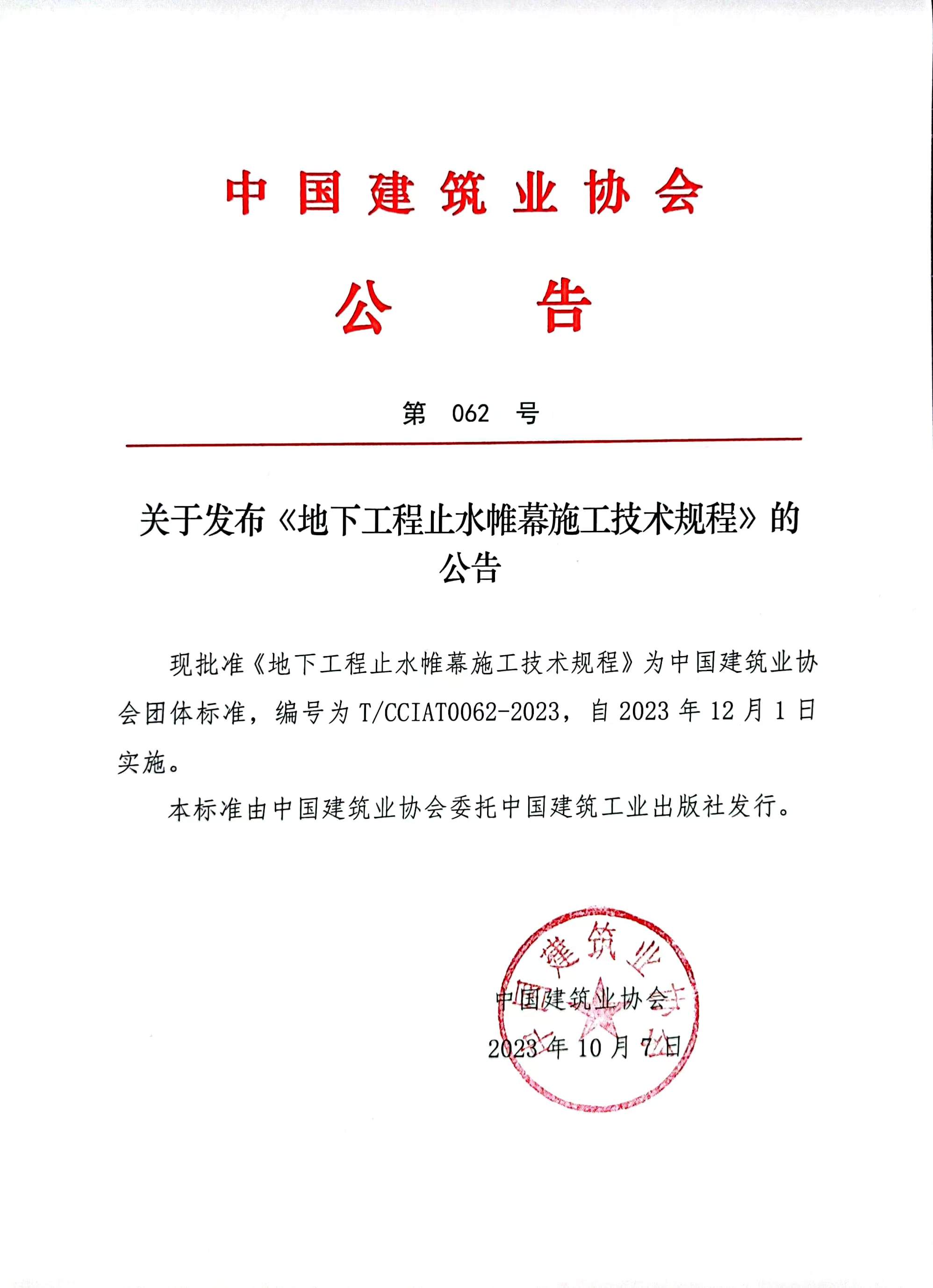 关于发布《地下工程止水帷幕施工技术规程》的公告