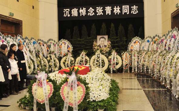 参加告别仪式的有关领导及各界人士,在哀乐中缓步走到张青林同志遗体前肃立默哀,向他的遗体三鞠躬作最后的告别,并和家属握手慰问。