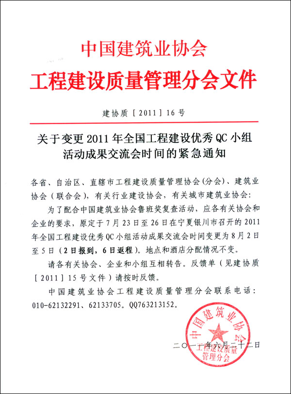 关于变更2011年全国工程建设优秀QC小组活动成果交流会时间的紧急通知