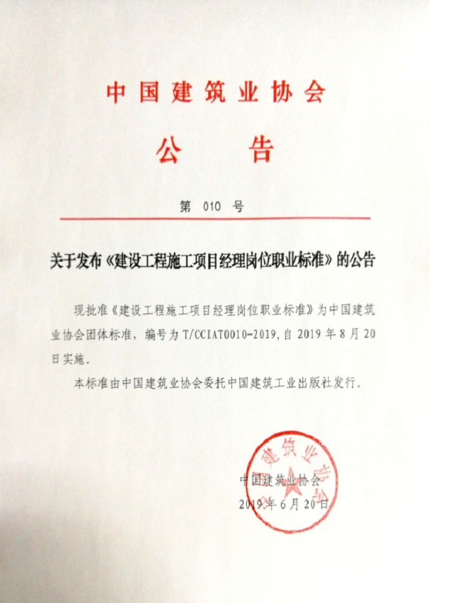 关于发布《建设工程施工项目经理岗位职业标准》的公告