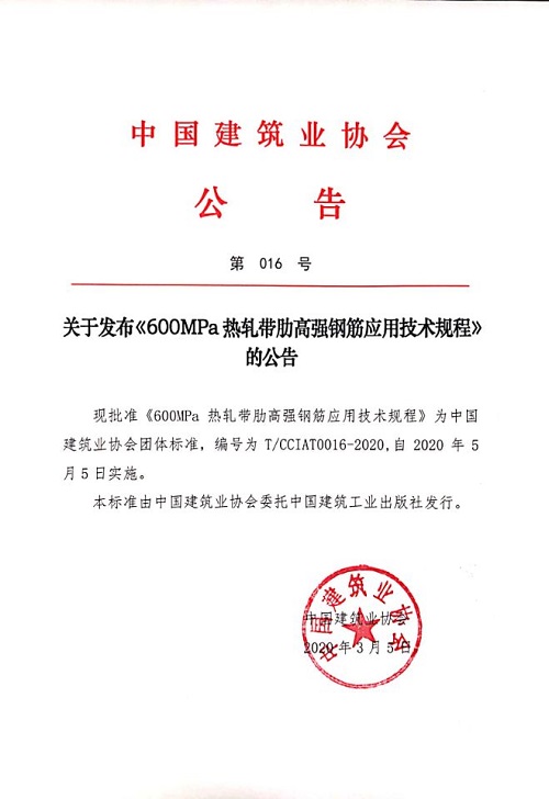 关于发布《600MPa热轧带肋高强钢筋应用技术规程》的公告