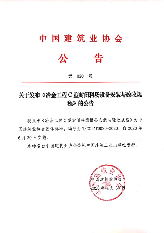 关于发布《冶金工程C型封闭料场设备安装与验收规程》的公告
