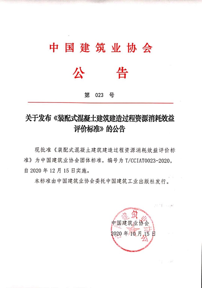 关于发布《装配式混凝土建筑建造过程资源消耗效益评价标准》的公告