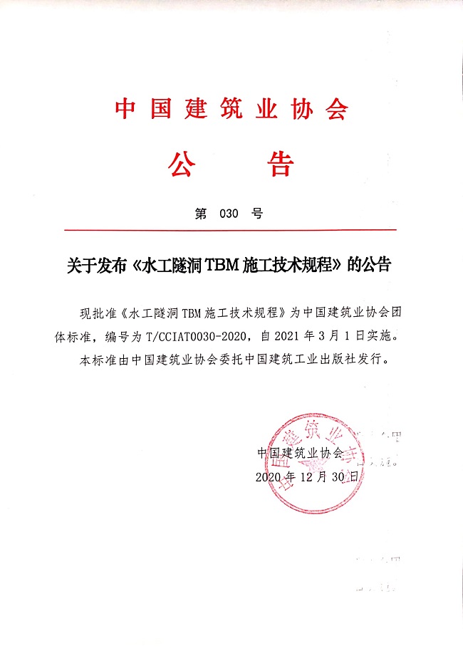 关于发布《水工隧洞TBM施工技术规程》的公告