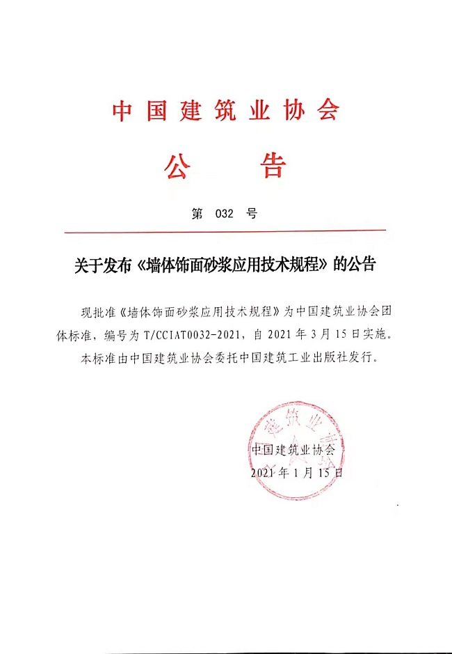关于发布《墙体饰面砂浆应用技术规程》的公告
