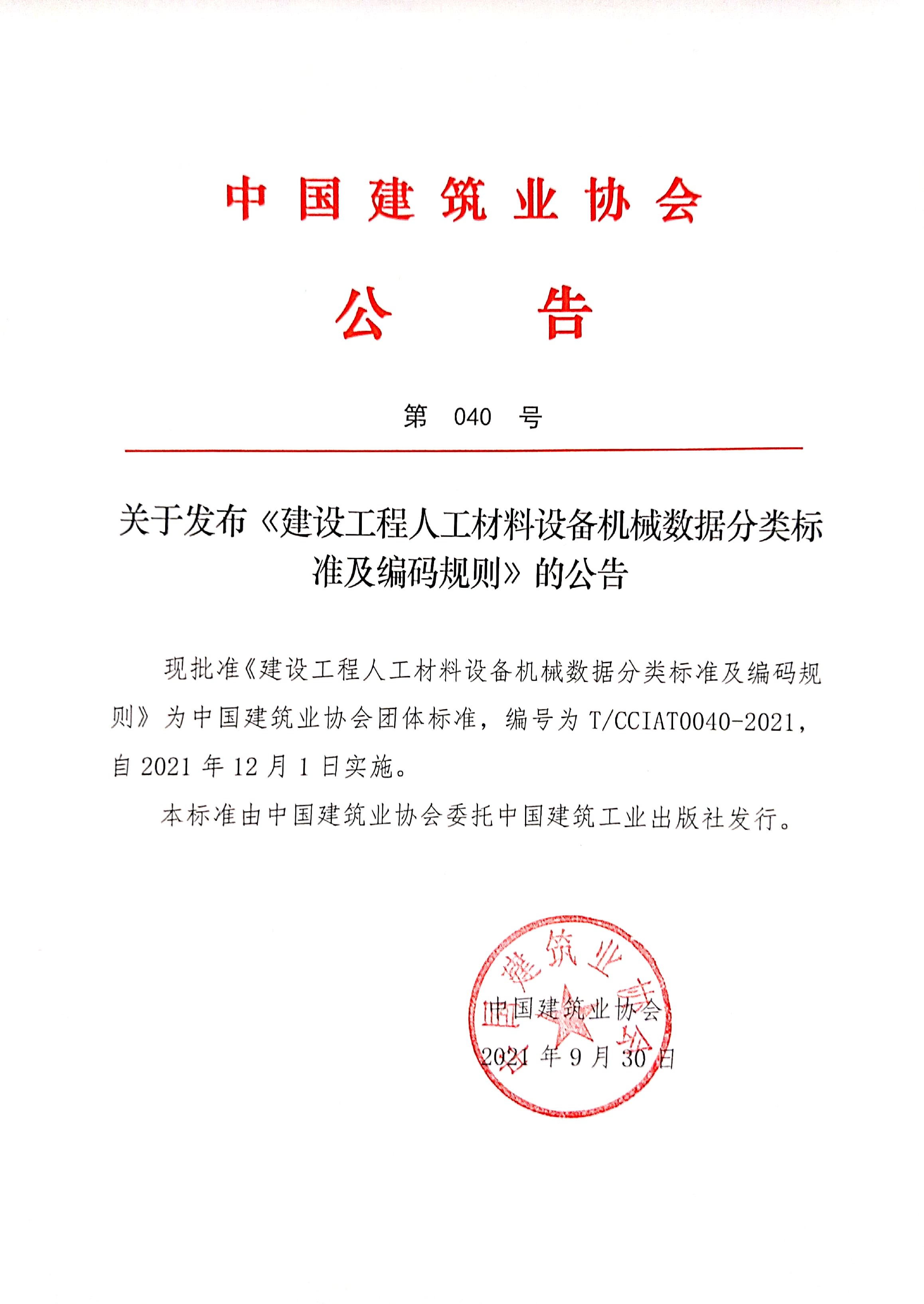 关于发布《建设工程人工材料设备机械数据分类标准及编码规则》的公告