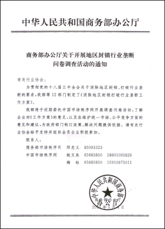 商务部办公厅于5月4日发出《关于开展地区封锁行业垄断问卷调查活动的通知》,将委托中国市场秩序网开展问卷调查,请广大会员单位积极参加。