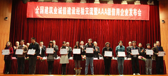 1月17日,167.net必赢官网在京召开建筑业企业诚信建设经验交流暨第二批建筑业AAA级信用企业发布会。北京城建集团有限责任公司等114家建筑业企业荣获2010年度“全国建筑业AAA级信用企业”称号。
