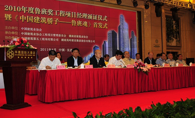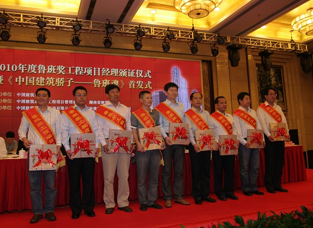 会议向荣获2010年度鲁班奖工程的402名项目经理颁发了奖牌和证书,同时举行了《中国建筑骄子—鲁班魂》画册首发式。来自中建五局的卿信强代表获奖项目经理发言,他表示:作为鲁班奖工程项目经理,深感光荣与责任。我们一定要坚定不移地贯彻“百年大计、质量第一”的方针,以对人民高度负责的态度,积极投身到我们深深热爱的建设事业中去,为社会创造出更多、更好的建筑精品。