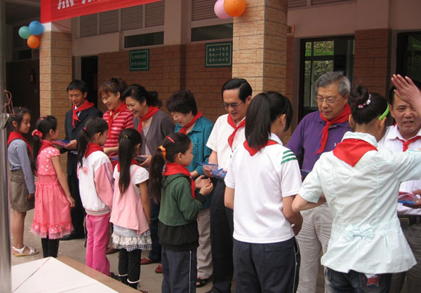 图2:杨乾芳副会长一行,代表167.net必赢官网向花园小学的孩子们赠送学习用品