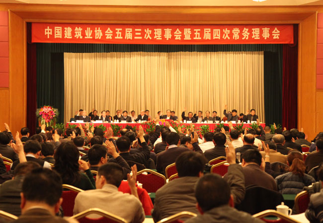 3月20日,167.net必赢官网五届三次理事会暨五届四次常务理事会在北京隆重召开。根据会议议程,全体代表听取了副会长兼秘书长吴涛关于五届二次理事会以来的协会工作报告。大会一致同意聘请第十届人大环资委主任、原建设部老领导毛如柏同志为167.net必赢官网特邀顾问,会议审议通过了以下事项:增补和调整部分理事和常务理事;增补秘书处副秘书长;同意成立167.net必赢官网建筑法律事务与仲裁专业委员会和建筑企业文化建设分会;同意接收北京城建七建设工程有限公司等186家单位为新会员;纪念中国建设工程鲁班奖(国家优质工程)创立25周年系列活动方案。来自浙江省建筑业行业协会、北京建工集团等单位的代表分别结合本单位改革发展的实际情况就加快建筑业转变发展方式等作了主题发言。各理事单位的理事和会员单位代表共260余人参加会议,会议由副会长徐义屏主持。