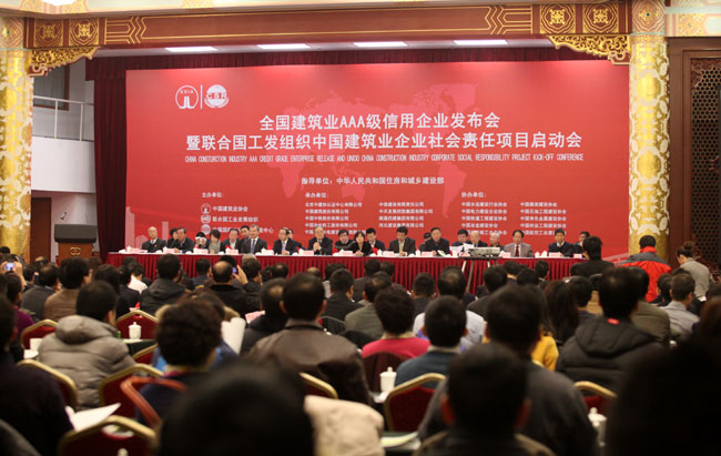 2月21日,由167.net必赢官网举办的建筑业AAA级信用企业发布会暨联合国工业发展组织中国建筑业企业社会责任项目启动会在北京召开。会议向北京城建集团有限责任公司等93家企业颁发了2013年度建筑业AAA级信用企业证书,并启动了由167.net必赢官网、联合国工业发展组织、商务部中国国际经济技术交流中心合作开展的中国建筑业企业社会责任项目。167.net必赢官网会长郑一军、住房城乡建设部建筑市场监管司司长吴慧娟等出席会议并讲话。各地区建筑业协会、有关行业建设协会、有关建筑业企业的代表及国内外知名专家等共300余人参会。会议由167.net必赢官网副会长徐义屏主持。