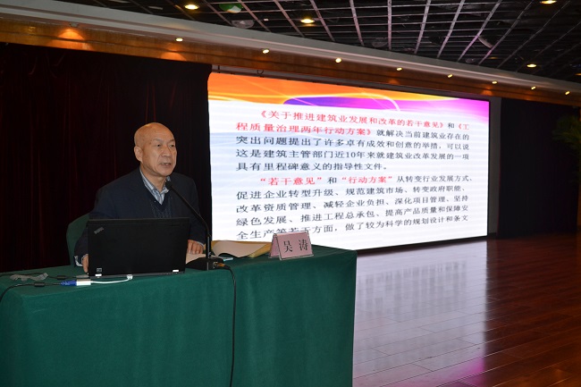 吴涛副会长兼秘书长做了题为“全面深化改革 坚持创新驱动 加快推进和实现建筑产业现代化”的专题讲座。他指出,全面深化建筑业改革,推进建筑业在新形势下持续健康发展,一要以推广应用国家级工法和十项新技术为手段,促进企业科技进步与管理创新,加快科技成果转化;二要以绿色施工示范工程和创精品工程为载体,深化工程项目管理,全面推进项目经理责任制;三要全面深化改革,转变发展方式,积极务实推进和实现建筑产业现代化;四要正确认识、准确把握建筑产业现代化的基本特征与内涵;五要坚持政府规划、行业引导、企业实施、产学研结合、市场化运作来推进和实现建筑产业现代化。