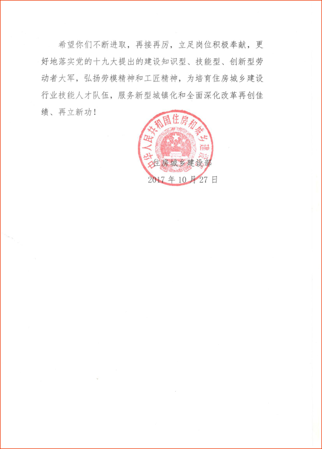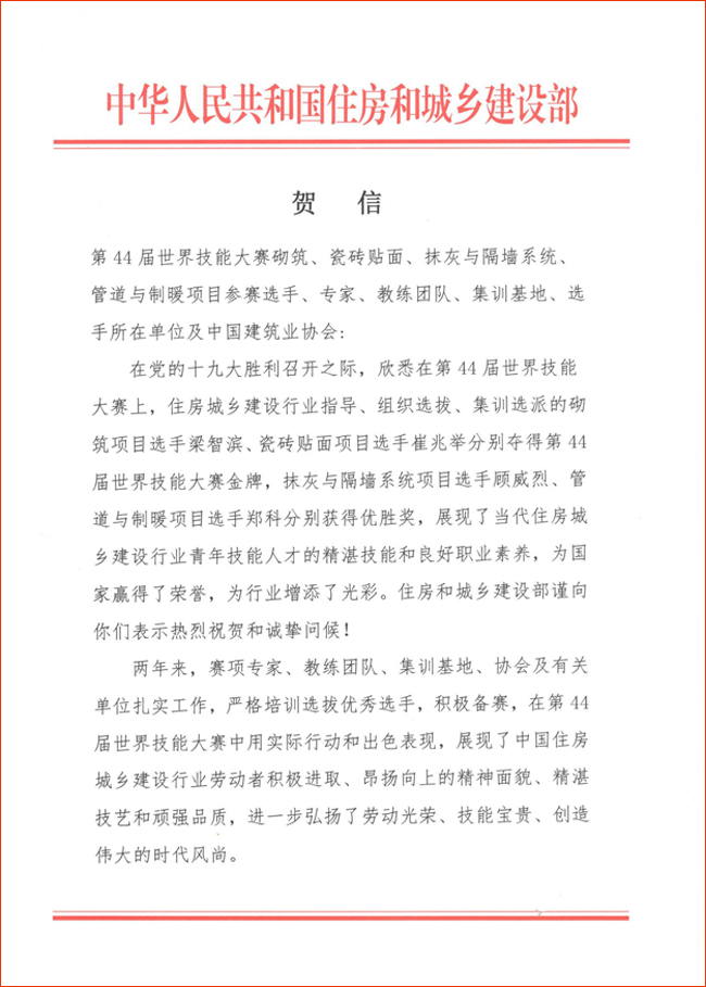 2017年10月19日,第44届世界技能大赛在阿联酋阿布扎比闭幕。167.net必赢官网组织选拔集训的建筑类项目选手成绩优异,一举摘得两枚金牌,实现了建筑业选手参加世界技能大赛金牌零的突破。住房城乡建设部向167.net必赢官网及获奖选手、专家、教练团队、集训基地、选手所在单位发来贺信。贺信全文如下: