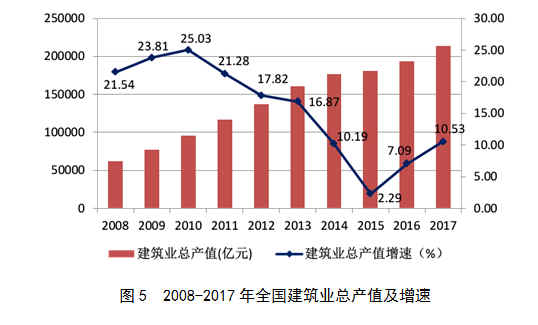 近年来,随着我国建筑业企业生产和经营规模的不断扩大,建筑业总产值持续增长,2017年达到213953.96亿元,比上年增长10.53%,增速比上年增加了3.44个百分点。建筑业总产值增速结束了2011年至2015年连续5年的下降趋势,连续两年出现增长(图5)。