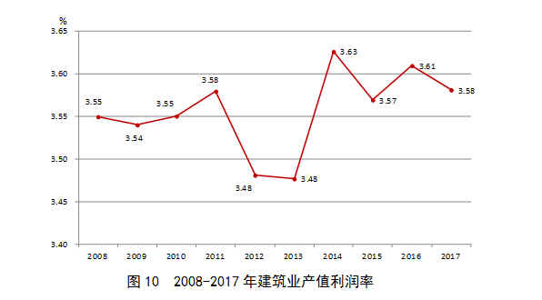近10年来,建筑业产值利润率(利润总额与总产值之比)一直在3.5%上下徘徊。2017年,建筑业产值利润率为3.58 %,比上年降低了0.03个百分点(图10)。
