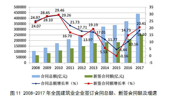 2017年,在以习近平同志为核心的党中央坚强领导下,建筑业深入学习贯彻党的十九大会议精神,认真落实《国务院办公厅关于促进建筑业持续健康发展的意见》(国办发〔2017〕19号),全面深化改革,加快转型升级,积极推进建筑产业现代化,整体发展稳中有进,发展质量不断提升。全国建筑业企业(指具有资质等级的总承包和专业承包建筑业企业,不含劳务分包建筑业企业,下同)完成建筑业总产值213953.96亿元,同比增长10.53%;完成竣工产值116791.89亿元,同比增长3.46%;签订合同总额439524.36 亿元,同比增长18.10%,其中新签合同额254665.71亿元,同比增长20.41%;完成房屋施工面积131.72亿平方米,同比增长4.19%;完成房屋竣工面积41.91亿平方米,同比下降0.78%;实现利润7661亿元,同比增长9.66%。截至2017年底,全国有施工活动的建筑业企业88059个,同比增长6.07%;从业人数5536.90万人,同比增长6.80%;按建筑业总产值计算的劳动生产率为347462元/人,同比增长3.11%。
