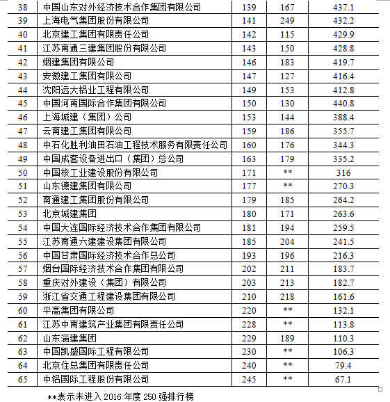 65家上榜企业中,有38家企业排名比上一年度有所提升,17家企业排名下降,排名未变的企业1家,新进榜企业9 家。中国交通建设股份有限公司连续10年排名中国上榜企业首位,名次继续保持在第3位(表1)。