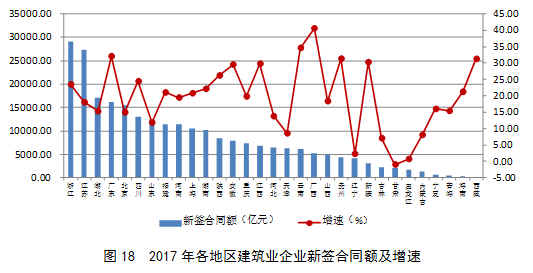 2017年,全国建筑业企业新签合同额254665.71亿元,比上年增长20.41%,增速较上年提高了4.99个百分点。浙江、江苏两省建筑业企业新签合同额继续占据前两位,分别达到29036.41亿元、27302.47亿元,占各自签订合同额总量的64.20%、60.83%,且出现较大幅度的增长,分别比上年增长了23.47%和18.07%。新签合同额超过8000亿元的还有湖北、广东、北京、四川、山东、福建、河南、上海、湖南、陕西等10个地区。新签合同额增速超过25%的有广西、云南、广东、贵州、西藏、新疆、江西、安徽、陕西等9个地区,分别增长40.56%、34.61%、32.07%、31.32%、31.24%、30.25%、29.77%、29.52%、26.19%。甘肃出现了-0.93%的负增长(图18)。