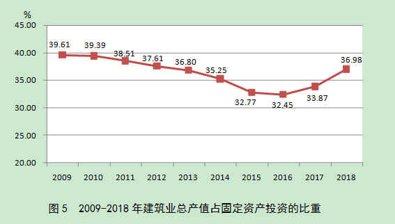2018年,固定资产投资(不含农户,下同)635636亿元,比上年增长5.90%,在总量保持增长的情况下增速继续呈下滑态势(图4)。与之相反,建筑业总产值占固定资产投资的比重连续两年保持扩大态势,2018年达到36.98%(图5)。