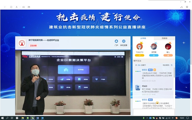 第三期公益直播讲座邀请中铁建设集团有限公司、北京市第三建筑工程有限公司、宁波市政工程建设集团股份有限公司,分别介绍央企、地方国企、民营企业在疫情期间做好“控疫情”和“促生产”工作情况。