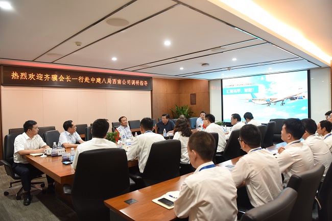 在中建八局西南公司,齐骥会长在听取了公司党委书记、董事长苗良田关于企业发展和重点工程项目建设相关情况的汇报后指出,西南分公司在工程质量和技术创新等方面取得了很好的工作成绩,要再接再厉,以科技创新推动公司更好发展。
