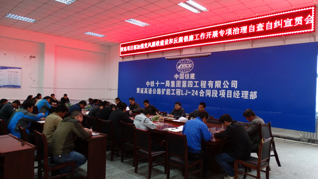 项目党工委书记王健首先传达了公司党委下发的关于加强党风建设和反腐倡廉工作开展专项治理自查自纠工作实施方案,决定采取深入学习教育等措施,对项目领导班子成员也建立专项治理自查自纠的测评表,要求项目全体人员对项目领导班子测评打分,为的是给全体职工做表率,让全体职工做好监督工作。还学习了习近平总书记关于作风建设、纪律建设的讲话精神,要对项目全体人员在动员、在部署。建全台帐,按时上报资料。要求项目领导班子和关键岗位人员必须深刻领会和贯彻习总书记重要指示精神,提高对项目党风建设和反腐败工作重要性的认识,为抓好项目党风建设和反腐倡廉工作,推动项目持续稳定提供牢固的思想基础和保障。