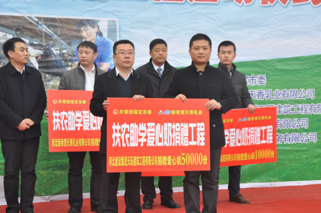 2015年1月18日,共青团保定市委联合河北新希望天香乳业有限公司组织的保定市“扶农助学”爱心奶捐赠工程启动仪式在市青少年宫举行。此次活动上,河北建设集团下属的子公司——天辰公司热心捐款5万元购买爱心奶,在体现了高度的社会责任感的同时,又为奶农和希望小学的孩子们送去社会的关怀和冬天的温暖。