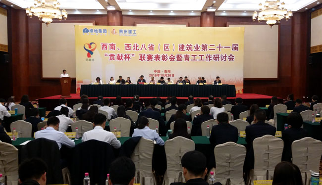 10月26日,由贵州建工集团承办的西南、西北八省(区)建筑业第二十一届“贡献杯”联赛表彰会暨青工工作研讨会在贵州隆重召开。贵州建工集团党委书记、董事长陈世华,共青团贵州省委副书记徐锡广,贵州省国资委党委委员、副主任陈健等领导出席表彰大会。来自西南、西北八省(区)建工集团的166名青年代表参加会议。