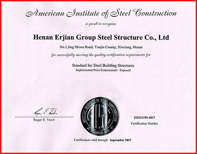 之前,美国专家专门到河南二建集团钢结构有限公司进行了为期三天的现场审核,AISC审核员从工艺、人员、组织机构、经验知识、设备以及质量方针的履行、目标和承诺进行了严格的审核,并对合同评审、不合格品控制、详图设计管理、原材料管理、生产过程控制、焊接工序控制、涂装工序控制等程序文件的实施进行了细致的审查。在审核末次会议上,AISC审核员对河南二建集团钢结构有限公司质量体系的运行情况给予了充分肯定,认为公司的质量体系运行符合美国AISC标准。