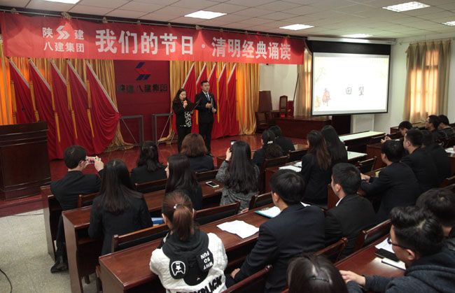 这是陕建八建集团团委举办主题为“传承经典文化、缅怀革命先烈、珍惜幸福生活”——我们的节日•清明经典诵读会。活动分为遥思、回望、感念三部分。一首首描绘春天景象、清明节习俗,以及缅怀革命先烈和亲人的诗歌,在音乐、图片的配合下一一呈现。《清明遥思》、《我的清明》、《不朽》、《祖国,你是我想唱的那首歌》、《清明祭•少年志 》、《长征回响》、《梦想在废墟上开花》、《写给爷爷》、《怀念晋Sir》,12名诵读者用吟诗歌赋的方式,在时光的轮回中,感受古人的生活与情趣,祭奠先烈,缅怀先贤千人,与现场职工一起细细品味了诗词的人文精华,感受中华传统节日与中华传统文化的独特魅力。(供稿人 量子 冯正)