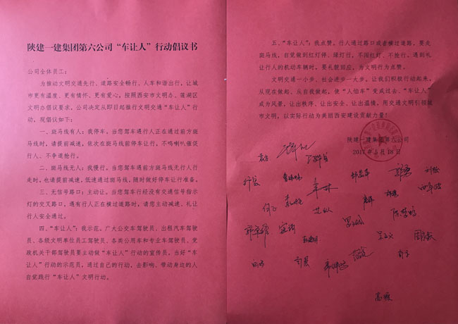 陕建一建集团第六公司作为市级文明单位,为进一步提升城市文明程度,让城市更有温度、更有情怀、更有爱心,按照西安市文明办、莲湖区文明办倡议要求,公司决定从即日起推行文明交通“车让人”行动,发起“车让人”倡议活动,从公司机关领导带头做起,签订倡议书,承诺文明出行。