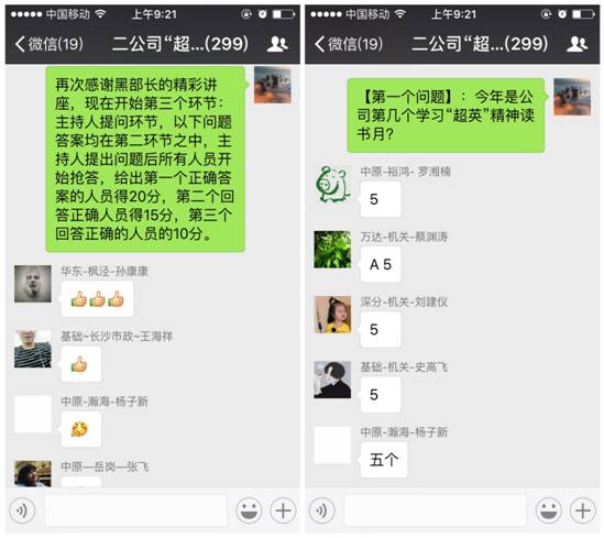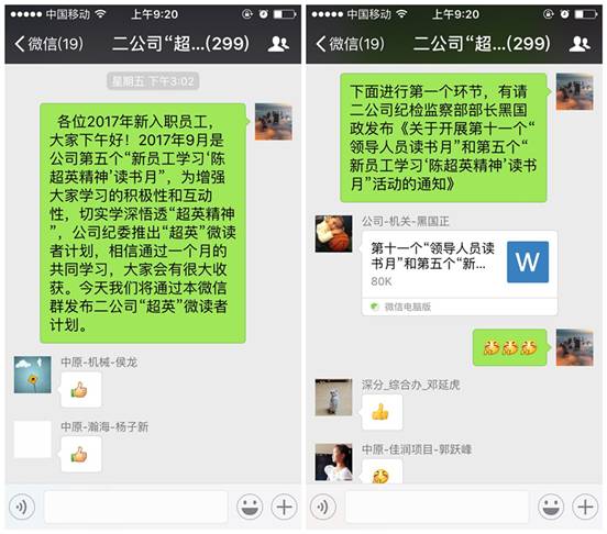今年9月份是二公司第五个新员工学习“陈超英精神”读书月,相比以往,今年通过微信群发布“超英微读者计划”活动,作为二公司首次推出的基于微信社群的读书活动,“超英微读者计划”一经推出即赢得了广泛好评,新员工纷纷点赞,踊跃参加。活动通过发布每日话题,开展主题讨论,邀请公司领导、优秀业务骨干开展专题讲座、互动交流及知识问答等环节增强整个活动的趣味性,应用微信管家辅助软件记录群成员的活跃情况,并通过“微积分”方式建立学习成长卡,作为后期“超英微读者计划”阅读小达人评选依据,切实增强全员阅读的积极性。