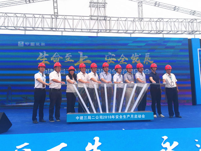 最后,参会主要领导共同按下启动器,宣布中建三局二公司2018年安全生产月启动。