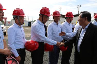 在项目建设现场,万钢副主席与现场施工技术人员亲切握手,了解他们的工作生活情况,感谢大家为中国援助事业付出的积极努力。集团援利比里亚政府办公楼项目施工技术组组长高元明向万钢副主席一行全面介绍了项目基本概况和施工进展情况。高元明表示,该项目是利比里亚国家重点建设工程,得到了政府各级领导的高度重视,江苏省建将不辱使命,持之以恒,将该项目打造成具有中国特色的援助工程,为中非友好和两国友谊添砖加瓦。