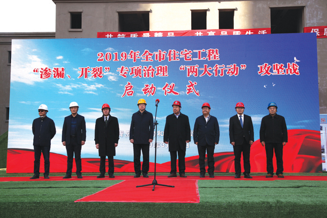 现场会上,青岛市住房城乡建设局党组书记、局长陈勇宣布2019年全市住宅工程“渗漏、开裂”专项治理“两大行动”攻坚战启动,并向全行业发出号召,坚持以人民为中心的发展思想,下大功夫解决群众居住生活“痛点”,聚焦住宅“渗漏、开裂”两大质量问题,以攻山头、炸碉堡的勇气和决心,采取切实有效的措施,大幅度减少新建住宅两大“顽疾”隐患,切实把质量投诉数量降下来,让更多的岛城市民享受到高品质住房带来的幸福感和获得感。