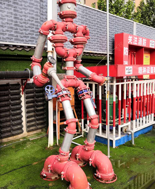 叫它“消防机器人”,其实并不是用来灭火的,只是组成它身体的每一个部件,都是工地上常用的消防和自来水管件。一旦PM值(空气中所含颗粒物)临界,它就会启动报警并自动喷淋降尘。