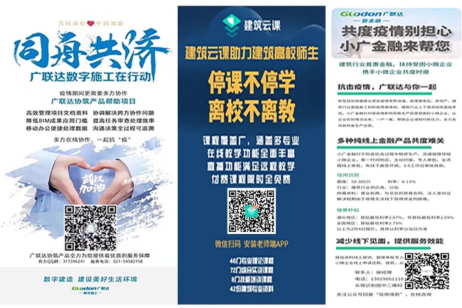 在防疫期间,广联达为企业提供移动办公、项目资料管理、跨方协作、BIM成果应用,以及运行环境安全检测、视频会议系统、开放远程任务及数据流转统计、精品课程实训等免费服务,帮助企业解决实际问题。帮助受疫情影响生产经营受困的小微企业,以提供信用贷款等多种形式,帮助企业减轻付款压力、恢复生产运营。同时,推出复工政策、风险挑战、专家连线、科技前瞻等多个“数字连线1+1”在线直播。
