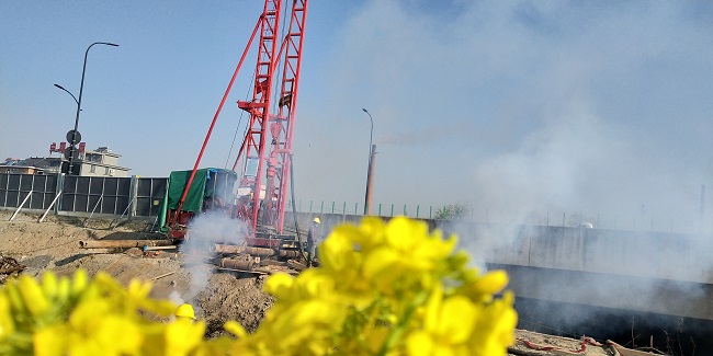 3月19日,随着鸣响的礼炮柯桥互通改扩建工程钻孔灌注桩首桩成功开钻。开钻的首桩是桥头直大桥0号右桩基,施工区域距既有钱滨线公路仅2米,最近处仅达1.3米,桥头直大桥是在既有的大桥两侧进行拼宽,本桥一共有八跨,其中有三跨在水中,土质上部为海积淤泥、中部为粉质黏土,且淤泥较深。此外右幅桩位下有六根弱电管线,左幅有一根直径1.2m自来水管,一根直径1.6m排水管,地下管线复杂,施工安全风险较大,本次首桩成功开钻,为接下来313根钻孔灌注桩的施工积累了施工经验,奠定了坚实基础。