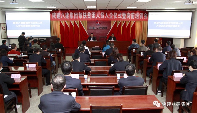 4月9日,陕建八建集团举办帮扶建档立卡贫困人员就业入企仪式暨岗前培训会。陕建八建集团党委副书记、总经理王勋出席会议并讲话,同时与集团副总经理刘宝军,工会副主席邵华分别为新入职人员佩戴司徽,发放生活用品。仪式由刘宝军主持。