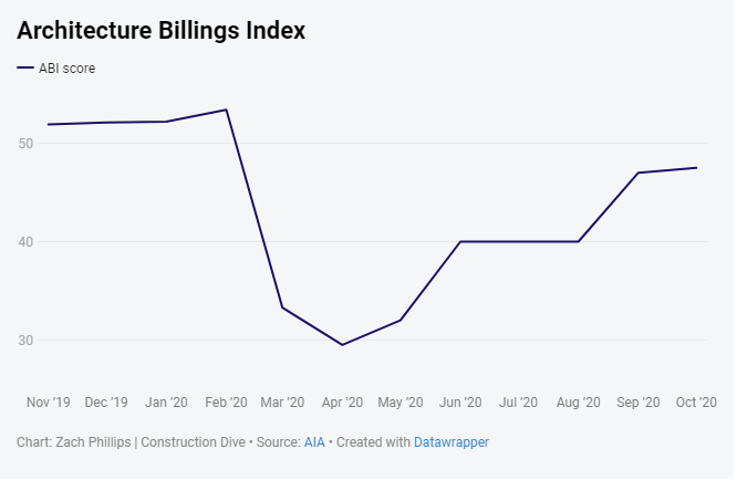 The ABI, from the American Institute of Architects, serves as an indicator of future construction spending — with a lead time of about nine to 12 months — as design services lead to new commercial projects. Any mark above 50 on the ABI indicates an increase in billings.