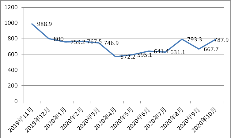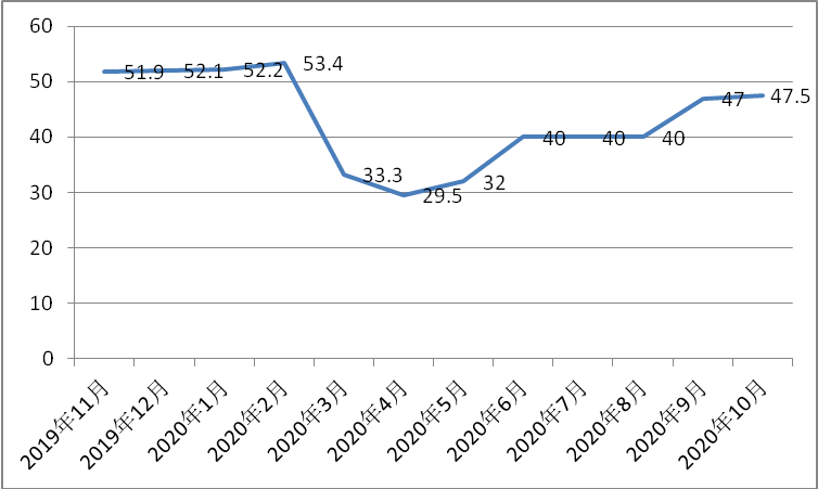 美国建筑师学会发布的建筑营业额指数(ABI)显示了9到12个月之后的建筑支出,即新开工商业项目指数,是衡量建筑业健康与否的一个指标,若数值超过50,则表明营业额增长。